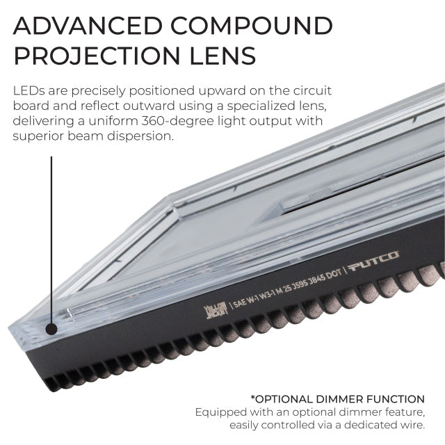 The YellowJacket’s advanced optical system features a precision-engineered Compound Projection Lens that maximizes light output and beam visibility. Featuring upward-facing high-power Amber/White LEDs and multiple lens elements, this compact 12×4.5-inch light bar outperforms standard 36-inch models, delivering 360-degree wide-angle coverage and intense beam focus for exceptional visibility—even in the most demanding environments, whether during busy daylight hours or nighttime traffic. Its high-intensity LEDs and advanced optical system cut through surrounding light to remain clearly visible in all conditions, setting a new benchmark in automotive safety lighting.