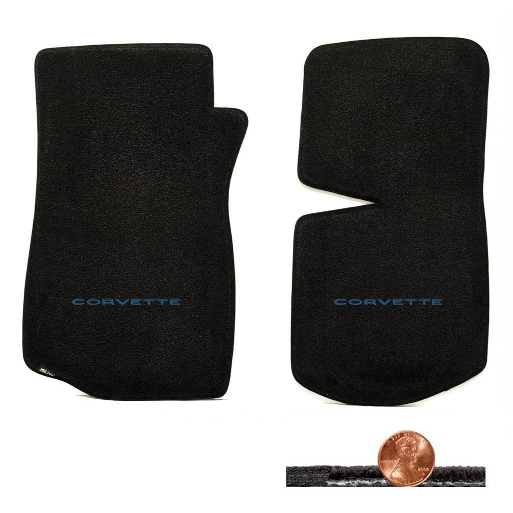 1968-1975 C3 Black 2pc Classic Loop Front Floor Mats - CORVETTE Logo in Blue