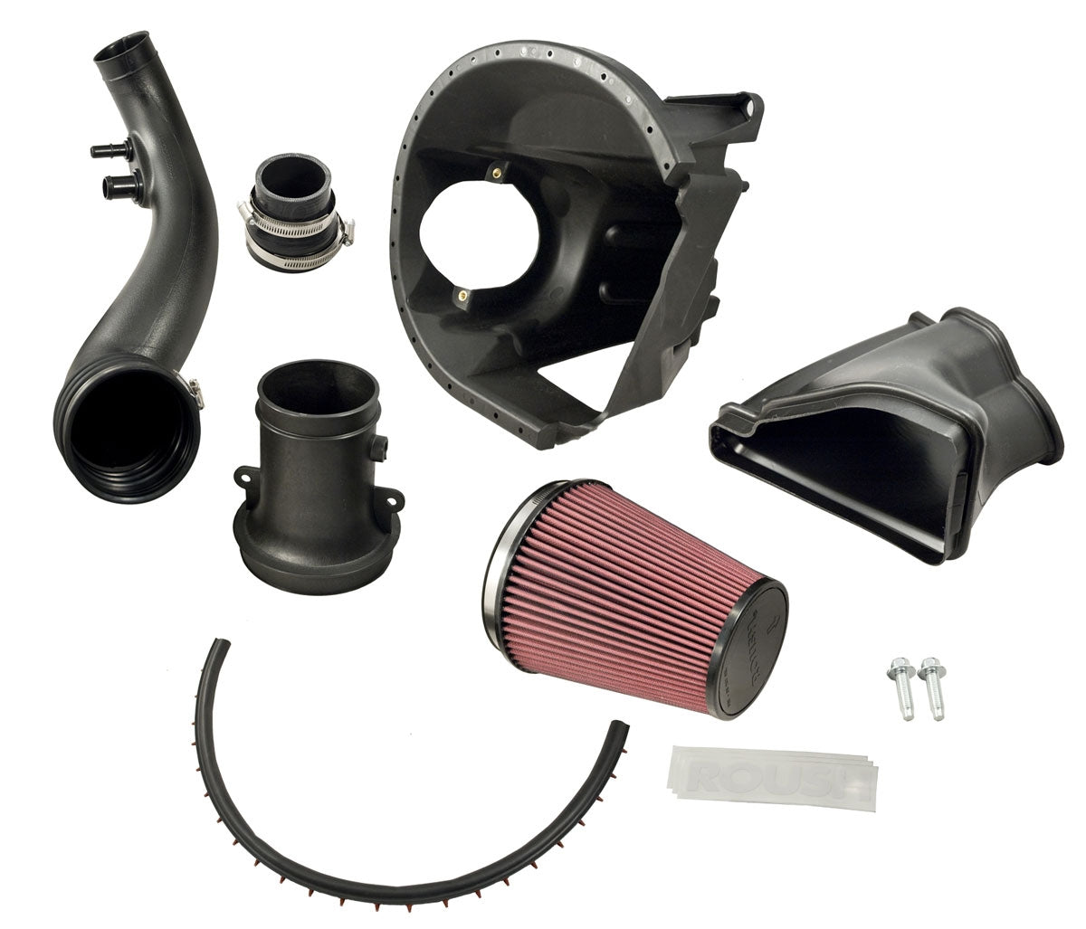 Included in the kit is the air filter with clamp, injection-molded lower air box/tray with installed EPDM foam hood seal, Blow Molded clean air tubes, heat extractor foam insert, and all required mounting hardware. The kit utilizes all factory emissions and vacuum lines. Factory mounting locations and hardware are utilized to allow for quick and easy installation.
